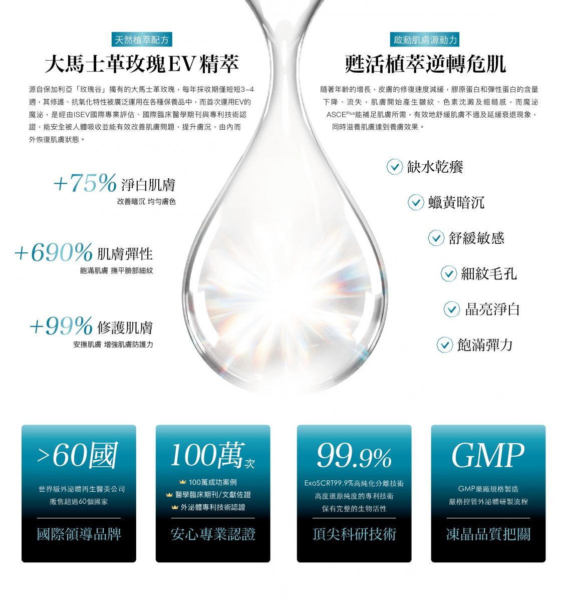 ASCEplus 魔泌正是運用這項科技,全面貫徹每層皮膚的健康環境。它利用EV中強大的基因遺傳物質、蛋白質、脂質、生長因子等豐富內容物,來達到以下效果:.降低肌膚迅速老化