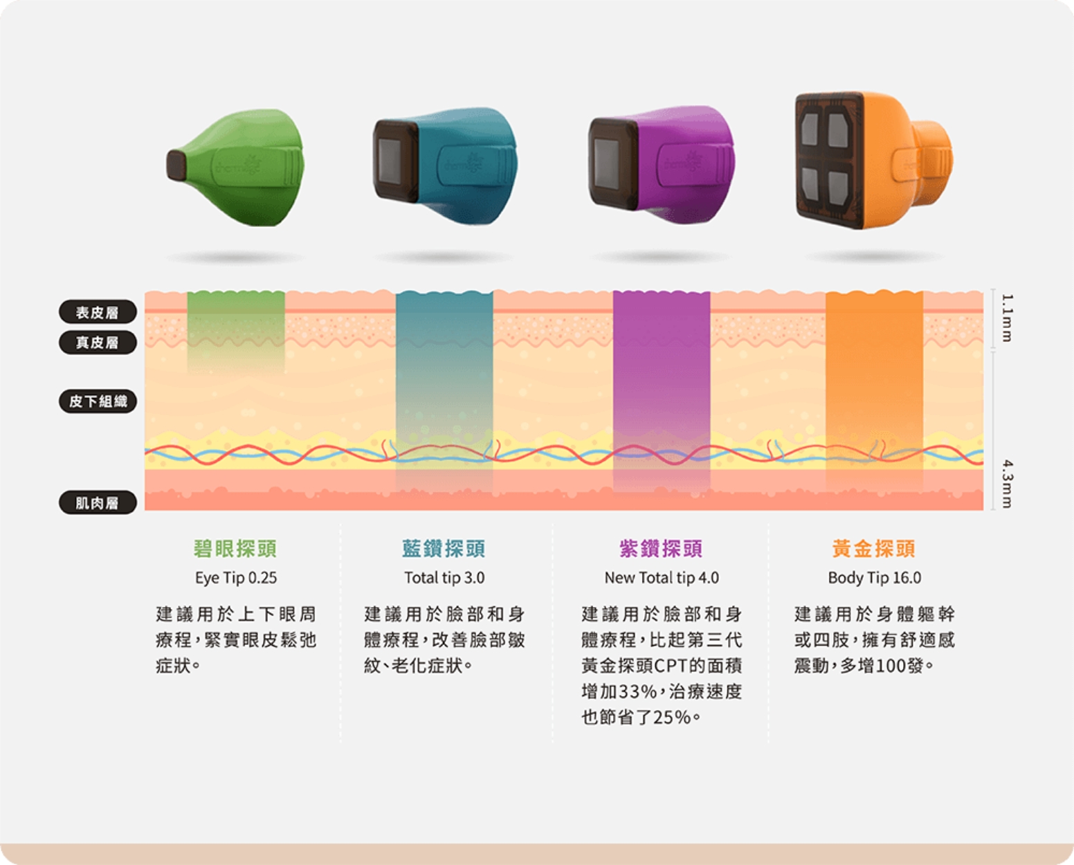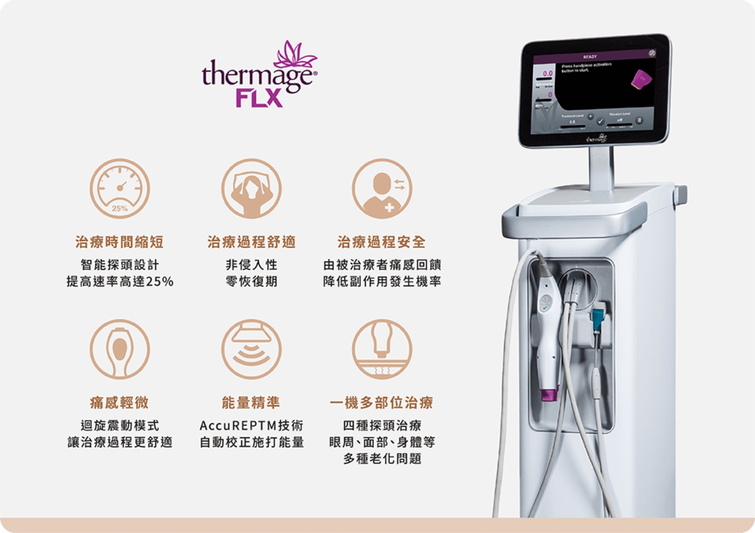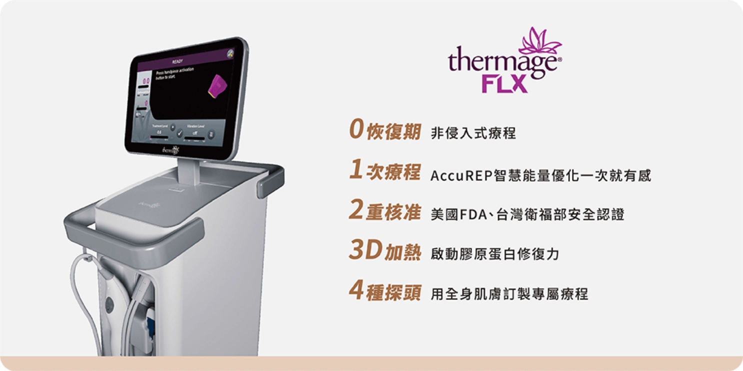 新一代Thermage FLX,擁有突破性的AccuREP智慧能量優化技術,自動精準偵測肌膚各式需求,多種探頭針對不同部位做治療,給予客製化的最佳能量,徹底治療。