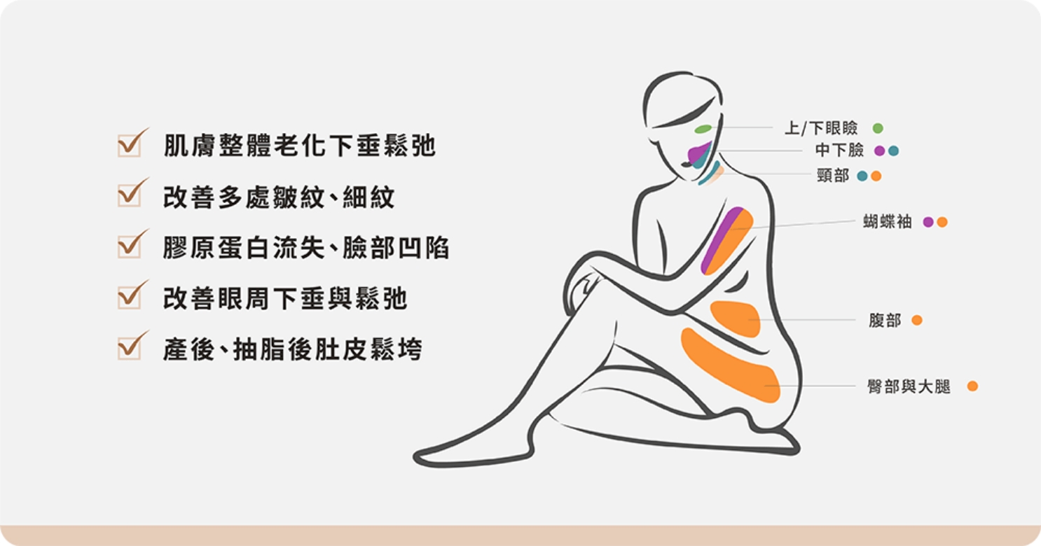 真皮層膠原蛋白在攝氏 45 至 60 度時,會出現立即收縮情況,這時運用電磁波產生的熱能,加熱真皮層膠原蛋白,來促進膠原蛋白的新生和更新代謝,除了能感受到向上拉、緊實平順的效果,還能在膠原新生階段持續緊緻。